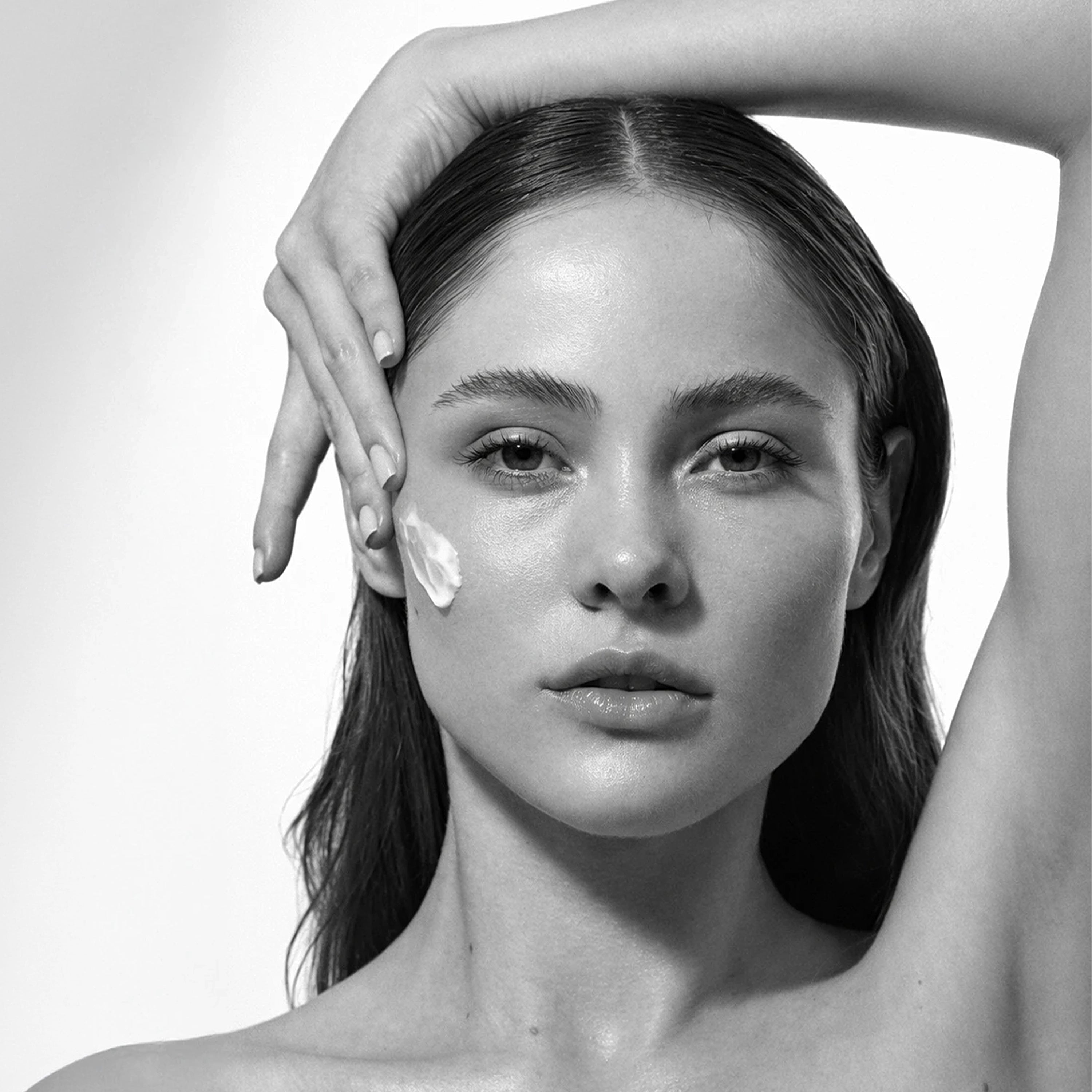 Close-up portrait of a woman sensing the Ahaa® Skincare moment as the product melts into her skin, capturing the intimate feeling of clarity and ritual.